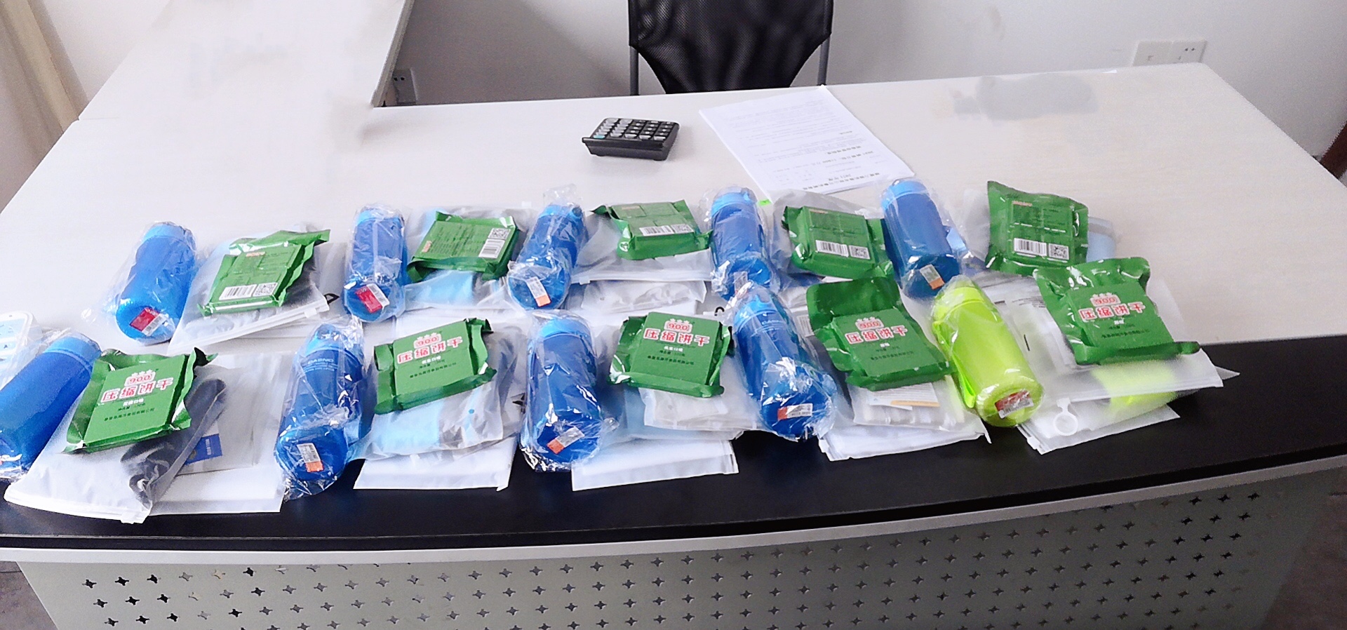 公司给每人统一配备一套运动装备,防水运动腰包,运动水壶,魔术方巾,冰袖,压缩饼干,提高徒步运动的舒适性。