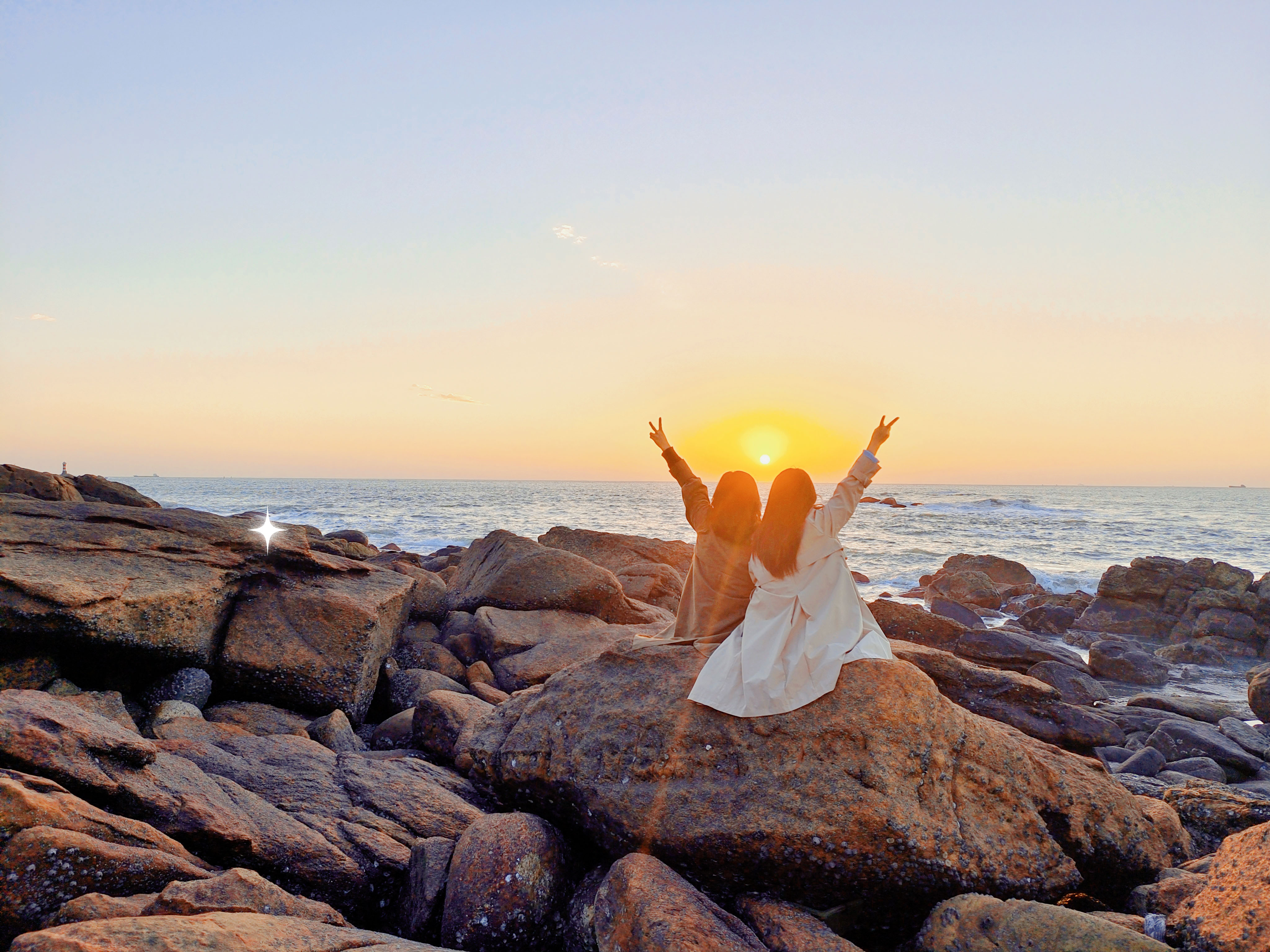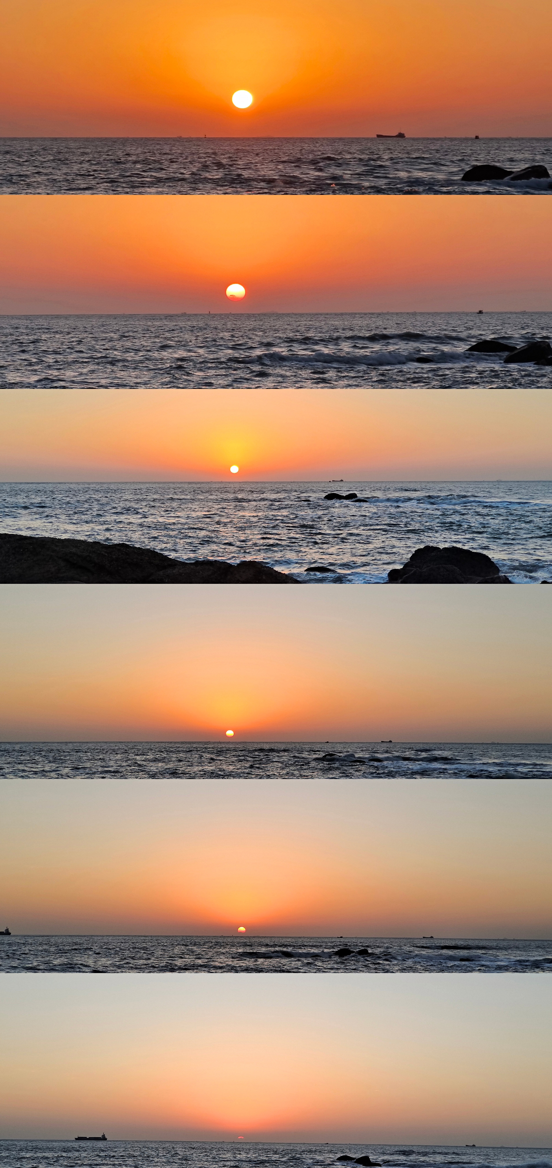 清晨六点,再次来到浯屿后江沙滩,天然的细沙海滩,波涛汹涌,层层叠叠,经过半个小时的等待,迎来了日出,迟到的太阳终于冲破雾气,跳出海面,初升的太阳照在脸上,一切都美轮美奂。